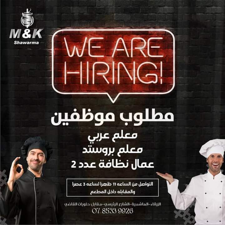 مطلوب للتوظيف الفوري لمجموعة مطاعم في عمان :