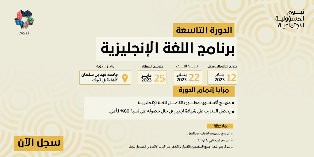 تعلن إدارة مشروع مدينة نيوم، عن إطلاق الدورة التاسعة من برنامج اللغة الإنجليزية بالتعاون مع (جامعة فهد بن سلطان الأهلية)، ويقدم البرنامج كوادر تدريبية متميزة وذات خبرة وكفاءة من حيث التدريب عبر منهج أكسفورد من خلال ثمانية أسابيع تشمل 160 ساعة تدريبية، وذلك وفقاً للتفاصيل الموضحة أدناه.