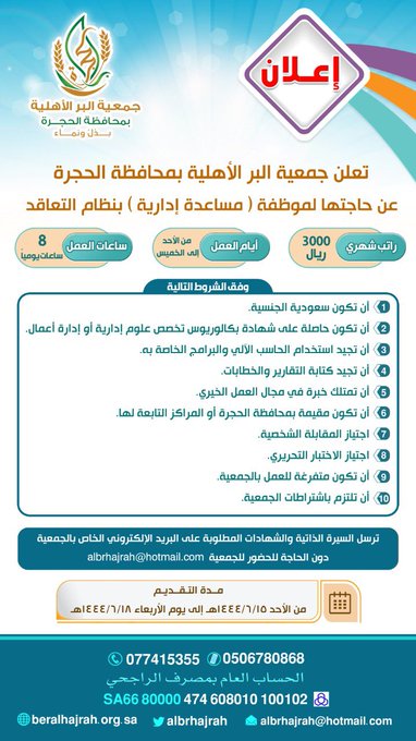 تعلن جمعية البر الأهلية، عبر موقع تويتر، عن توفر وظائف شاغرة (للجنسين) لحملة الدبلوم فأعلى، للعمل بمحافظة الحجرة بمنطقة الباحة ، وذلك وفقاً للتفاصيل التالية: