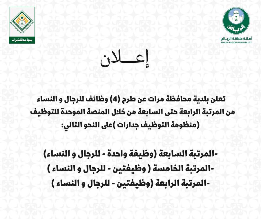تعلن بلدية محافظة مرات عن وظائف شاغرة (للجنسين) عبر منظومة التوظيف (جدارات)