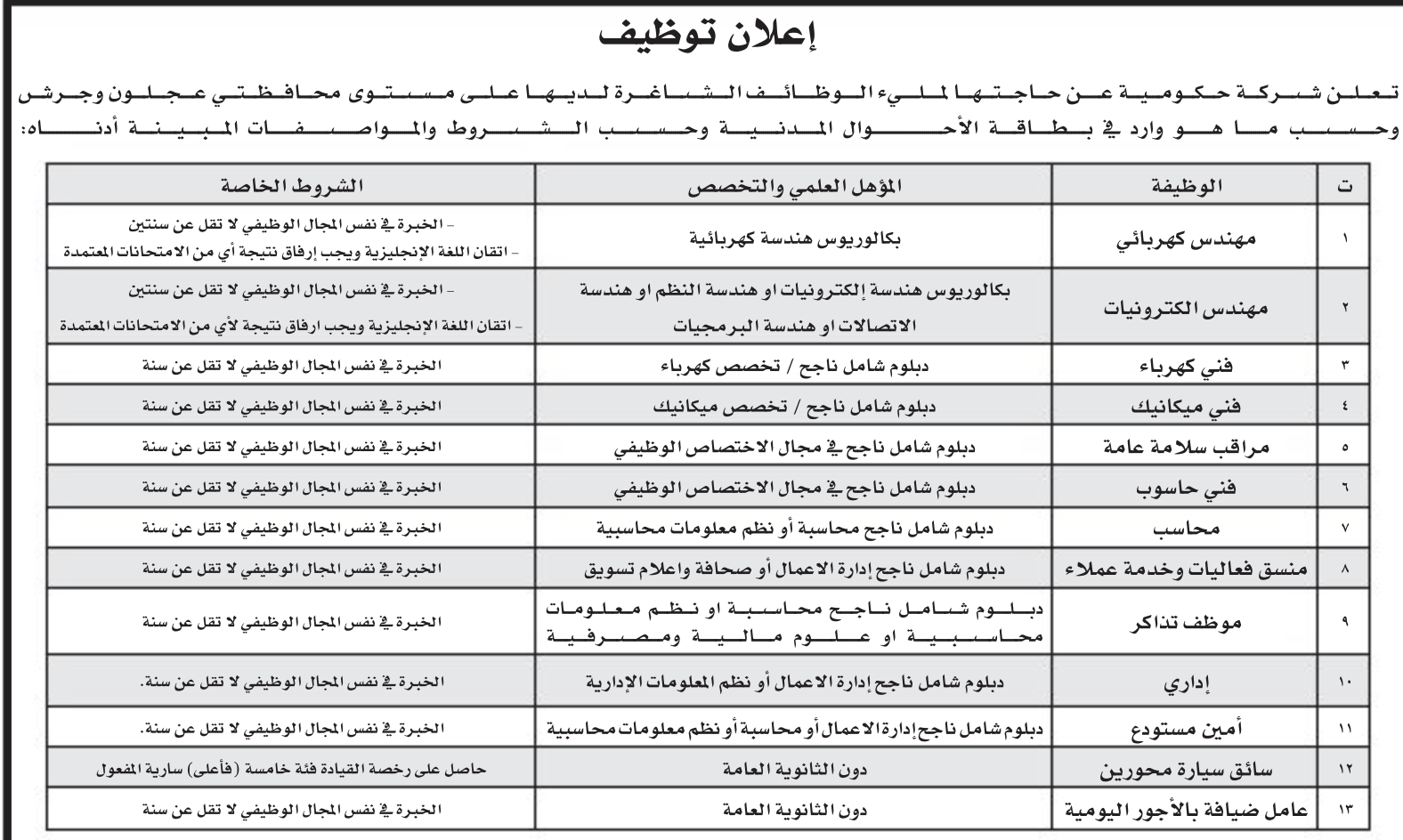 اعلان توظيف صادر عن شركة حكومية في الاردن