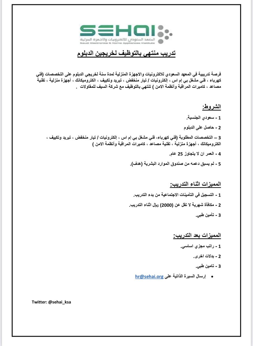 يعلن المعهد السعودي للإلكترونيات والأجهزة المنزلية (سيهاي) عن تدريب منتهي بالتوظيف لخريجي الدبلوم للعمل مع شركة السيف للمقاولات، وذلك وفقاً للتفاصيل التالية: